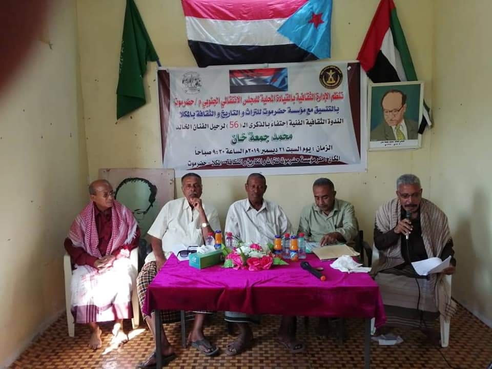 ثقافية انتقالي حضرموت تنظم ندوة في الذكرى الـ56 لرحيل الفنان محمد جمعة خان نظمت الإدارة الثقافية بالقيادة المحلية للمجلس الانتقالي الجنوبي بمحافظة حضرموت بالتنسيق مع مؤسسة حضر...