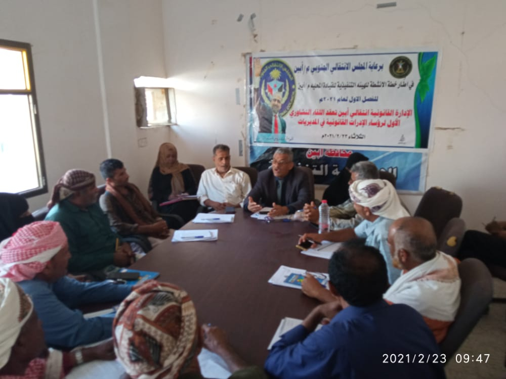 الإدارة القانونية بتنفيذية انتقالي أبين تعقد اللقاء التشاوري الأول لمديري الإدارات القانونية في المديريات عقدت الإدارةُ القانونية بالهيئة التنفيذية للقيادة المحلية للمجلس الانتقالي الجنوبي بمحافظة أبين، الي...