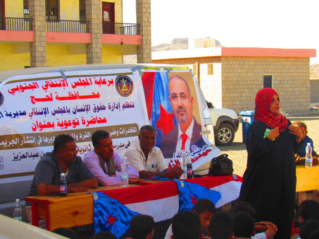 حقوق الإنسان بتنفيذية انتقالي الملاح تنظم محاضرات توعوية عن المخدرات وضررها على الفرد والمجتمع نظمت إدارة حقوق الإنسان بالهيئة التنفيذية للقيادة المحلية للمجلس الانتقالي الجنوبي بمديرية الملاح بم...