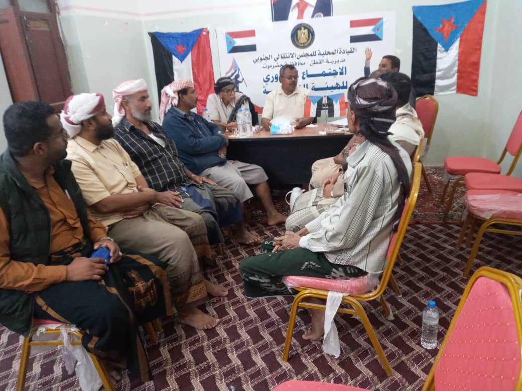 تنفيذية انتقالي القطن تناقش تقارير تقييم الأنشطة والفعاليات المنفذة عقدت الهيئة التنفيذية للقيادة المحلية للمجلس الانتقالي الجنوبي بمديرية القطن، اليوم الاثنين، اجتما...