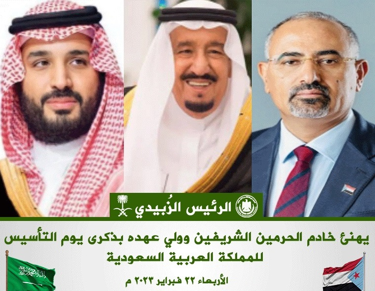 الرئيس الزُبيدي يهنئ خادم الحرمين الشريفين وولي عهده بذكرى يوم التأسيس للمملكة العربية السعودية الرئيس الزُبيدي يهنئ خادم الحرمين الشريفين وولي عهده بذكرى يوم التأسيس للمملكة العربية السعودية