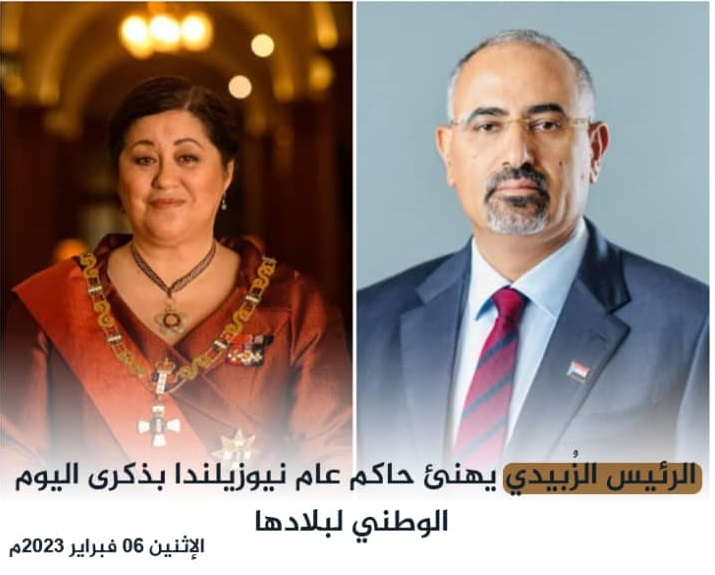 الرئيس الزُبيدي يهنئ حاكم عام نيوزيلندا بذكرى اليوم الوطني لبلادها الرئيس الزُبيدي يهنئ حاكم عام نيوزيلندا بذكرى اليوم الوطني لبلادها