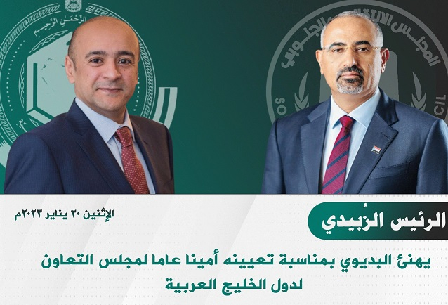 الرئيس الزُبيدي يهنئ البديوي بمناسبة تعيينه أمينا عاما لمجلس التعاون لدول الخليج العربية الرئيس الزُبيدي يهنئ البديوي بمناسبة تعيينه أمينا عاما لمجلس التعاون لدول الخليج العربية