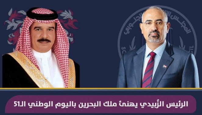 الرئيس الزُبيدي يهنئ ملك البحرين باليوم الوطني الـ51 الرئيس الزُبيدي يهنئ ملك البحرين باليوم الوطني الـ51