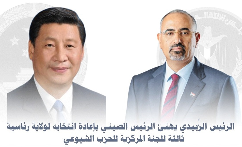 الرئيس الزُبيدي يهنئ الرئيس الصيني بإعادة انتخابه لولاية رئاسية ثالثة للجنة المركزية للحزب الشيوعي الرئيس الزُبيدي يهنئ الرئيس الصيني بإعادة انتخابه لولاية رئاسية ثالثة للجنة المركزية للحزب الشيوعي