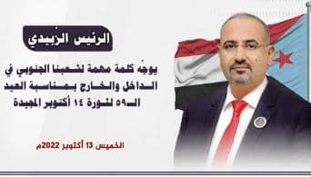 الرئيس الزُبيدي يوجّه كلمة مهمة لشعبنا الجنوبي في الداخل والخارج بمناسبة العيد الـ59 لثورة 14 أكتوبر المجيدة الرئيس الزُبيدي يوجّه كلمة مهمة لشعبنا الجنوبي في الداخل والخارج بمناسبة العيد الـ59 لثورة 14...