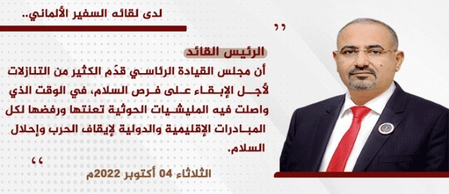 الرئيس الزُبيدي: قدمنا الكثير من التنازلات لأجل السلام وحان الوقت لوقف غطرسة المليشيات لدى لقائه السفير الألماني.. الرئيس الزُبيدي: قدمنا الكثير من التنازلات لأجل السلام وحان الوقت...