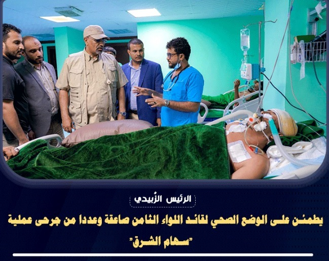 الرئيس الزُبيدي يطمئن على الوضع الصحي لقائد اللواء الثامن صاعقة وعددا من جرحى عملية "سهام الشرق" الرئيس الزُبيدي يطمئن على الوضع الصحي لقائد اللواء الثامن صاعقة وعددا من جرحى عملية "سهام الشرق"