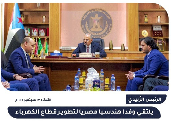 الرئيس الزُبيدي يلتقي وفدا هندسيا مصريا لتطوير قطاع الكهرباء التقى الرئيس القائد عيدروس قاسم الزُبيدي رئيس المجلس الانتقالي الجنوبي، نائب رئيس مجلس القيادة الرئا...
