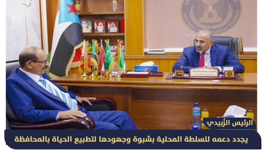 الرئيس الزُبيدي يجدد دعمه للسلطة المحلية بشبوة وجهودها لتطبيع الحياة بالمحافظة الرئيس الزُبيدي يجدد دعمه للسلطة المحلية بشبوة وجهودها لتطبيع الحياة بالمحافظة