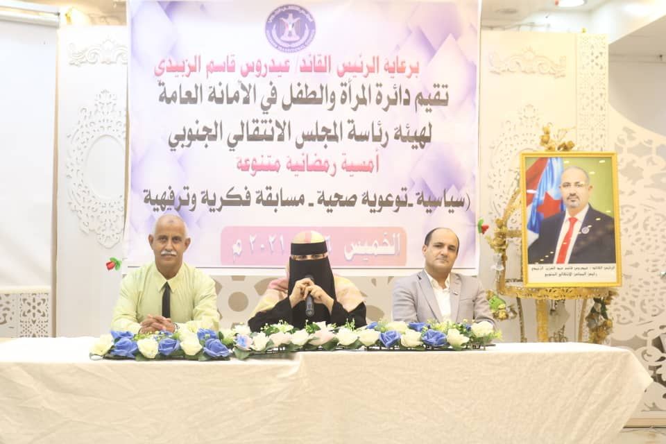 برعاية الرئيس الزُبيدي... دائرة المرأة والطفل تنظم أمسية رمضانية متنوعة نظمت دائرة المرأة والطفل بالأمانة العامة لهيئة رئاسة المجلس الانتقالي الجنوبي، اليوم الخميس، أمسية ر...