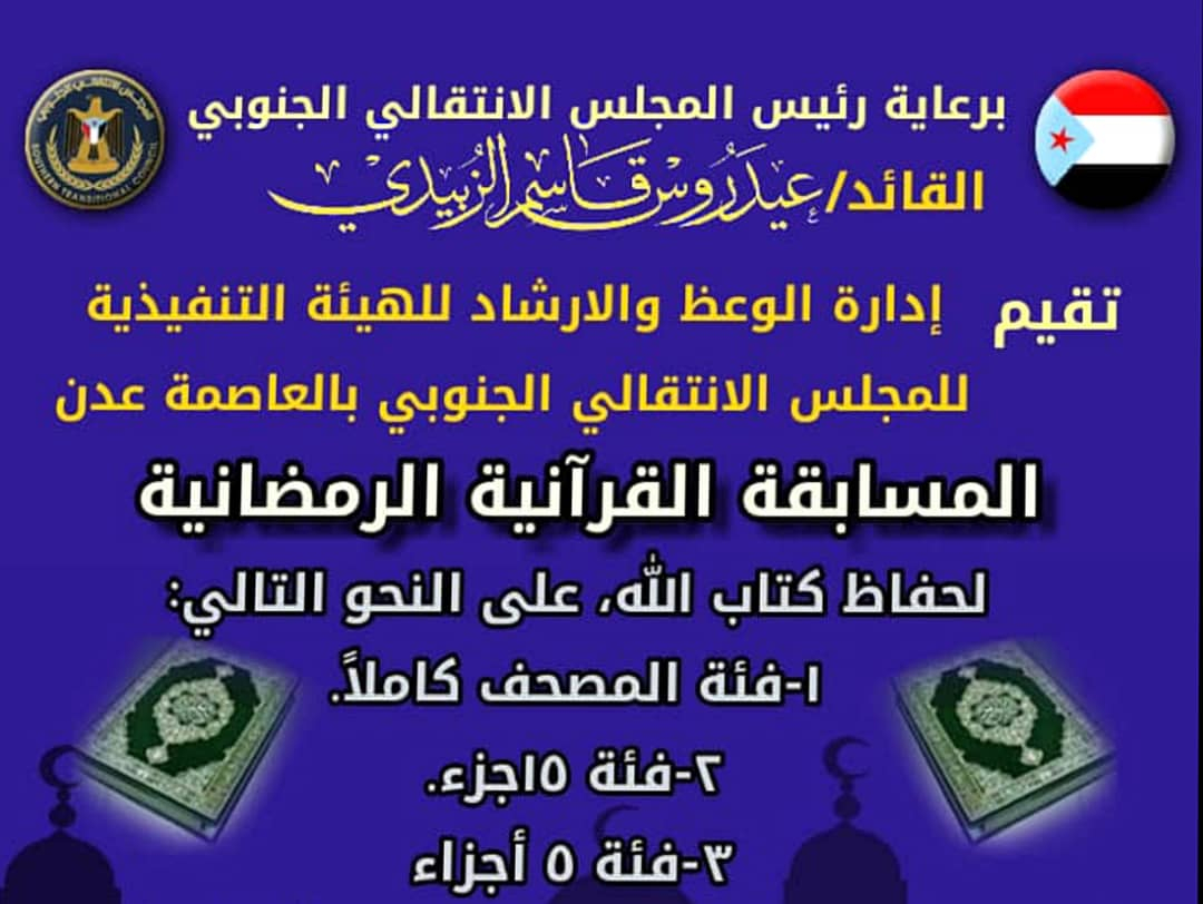 برعاية الرئيس الزُبيدي .. إدارة الوعظ والإرشاد بتنفيذية انتقالي العاصمة عدن تنظم مسابقة "حفظ القرآن الڪريم" تنظم إدارة الوعظ والإرشاد بالهيئة التنفيذية بالقيادة المحلية للمجلس الانتقالي الجنوبي في العاصمة ع...