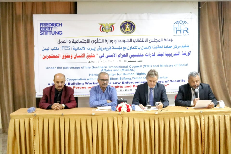 الجعدي يدشن أعمال الورشة التدريبية التي تنظمها "فريدريش إيبرت" ومركز حماية لحقوق الإنسان لمنتسبي الحزام الأمني بعدن دشن الأستاذ فضل محمد الجعدي نائب الأمين العام للأمانة العامة لهيئة رئاسة المجلس الانتقالي الجنوبي ال...