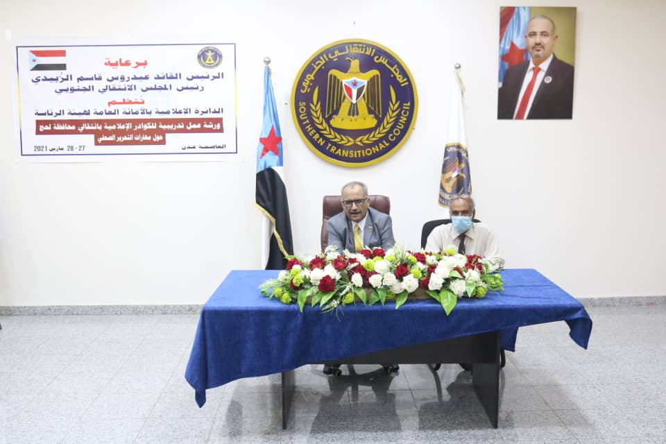 الدائرة الإعلامية تختتم الورشة التدريبية في "مهارات التحرير الصحفي" للكوادر الإعلامية بانتقالي محافظة لحج اختتمت الدائرة الإعلامية في الأمانة العامة لهيئة رئاسة المجلس الانتقالي الجنوبي، اليوم الأحد، ورشة ا...