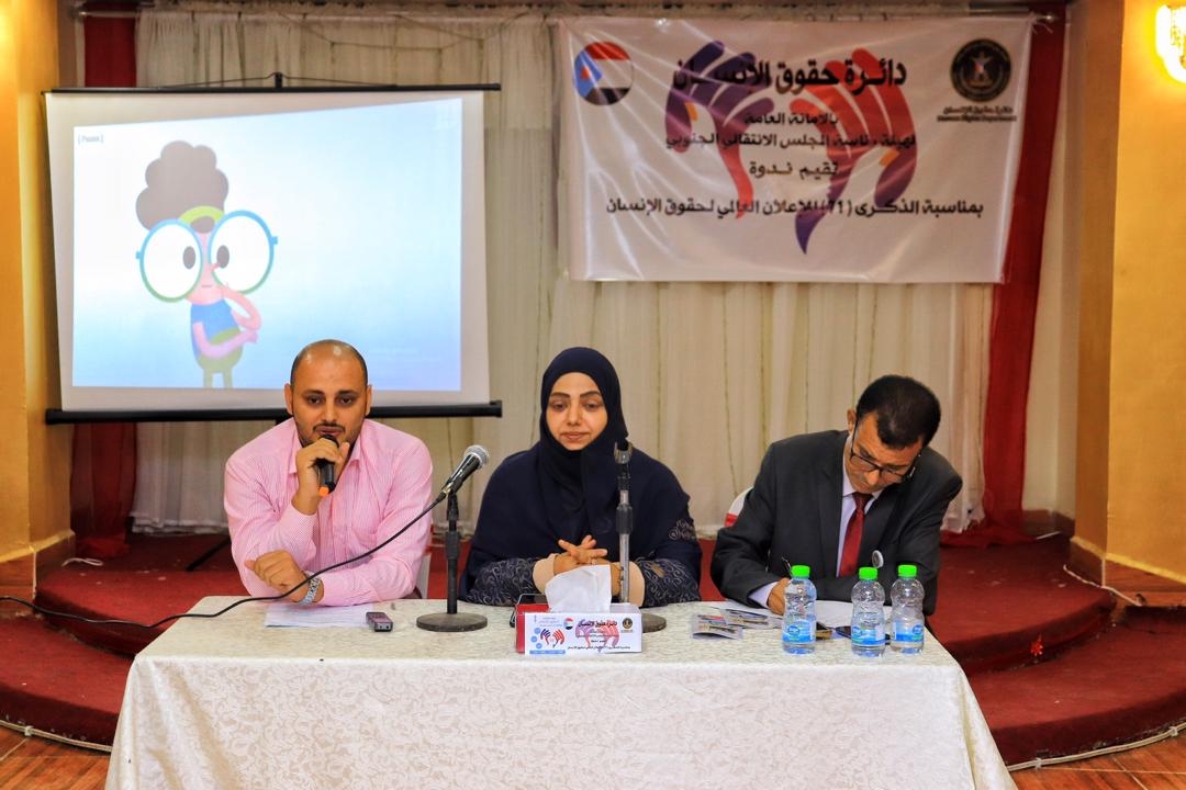 دائرة حقوق الإنسان تقيم ندوة حقوقية وقانونية بمناسبة الذكرى 71 للإعلان العالمي لحقوق الإنسان أقامت دائرة حقوق الإنسان بالأمانة العامة لهيئة رئاسة المجلس الانتقالي الجنوبي، اليوم الخميس، ندوة بم...