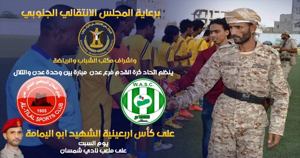 السبت .. التلال والوحدة في أربعينية شهيد الوطن "أبو اليمامة" برعاية المجلس الانتقالي أعلن الأخ مؤمن حسن السقاف، رئيس دائرة الشباب والرياضة بالأمانة العامة لهيئة رئاسة المجلس الانتقالي ا...