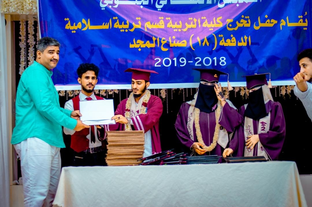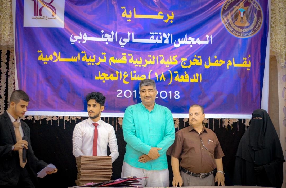 شهدت قاعة كلية التربية بجامعة عدن، صباح اليوم الثلاثاء، حفل تخرج دفعة "صُنّاع المجد" لعدد 100 خرِّيج وخرِّيجة، من طلبة قسم التربية الإسلامية، برعاية من المجلس الانتقالي الجنوبي، ممثلا بدائرة الشباب والطلاب بالأمانة العامة لهيئة رئاسة المجلس.