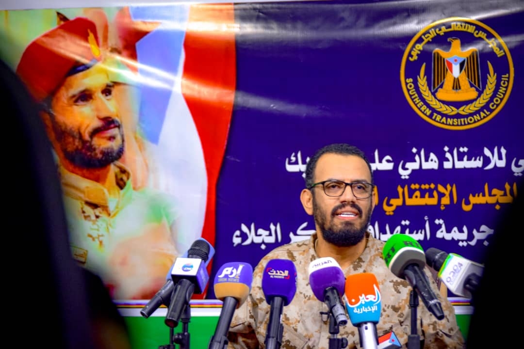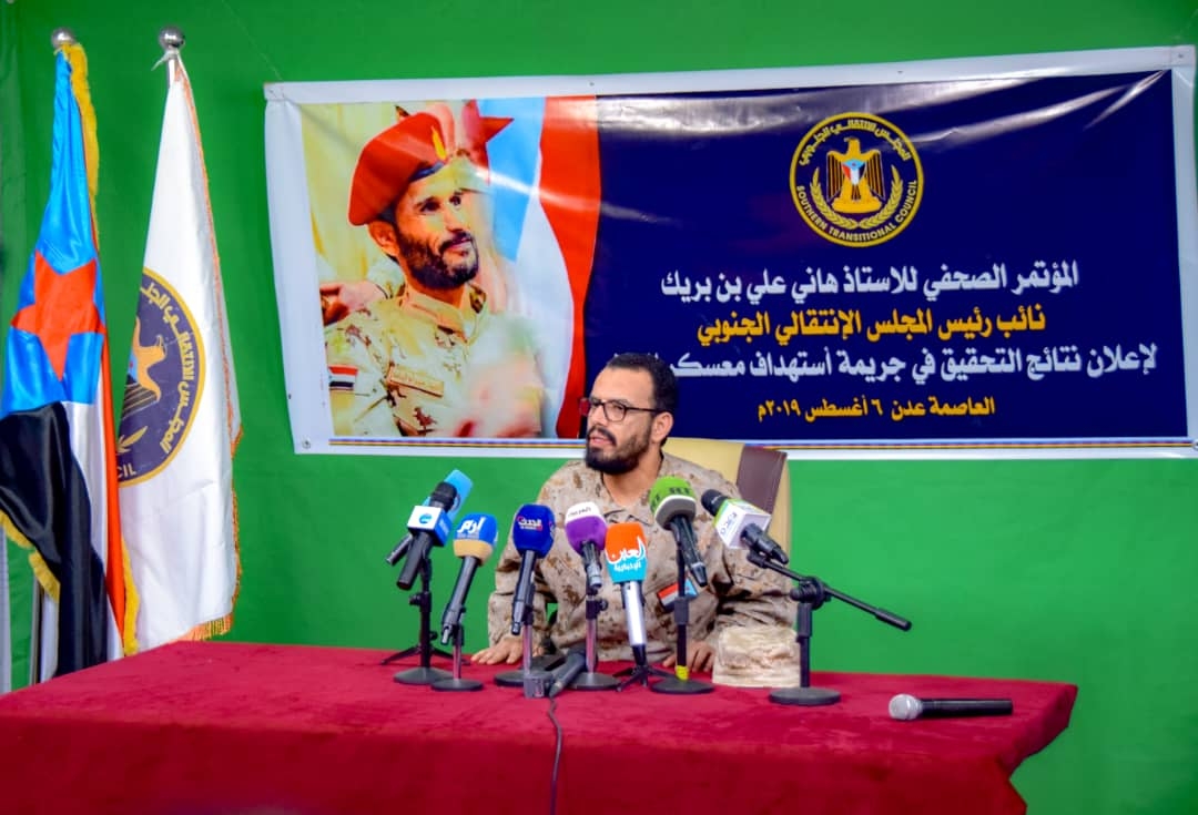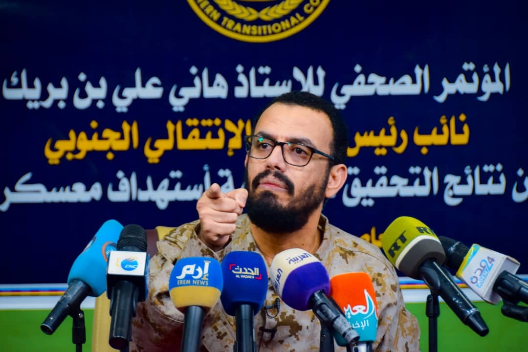 عقد الأستاذ هاني علي بن بريك، نائب رئيس المجلس الانتقالي الجنوبي، اليوم الثلاثاء، مؤتمراً صحفياً بالعاصمة عدن، كشف فيه ملابسات جريمة استهداف معسكر الجلاء، الخميس الماضي، والتي أسفرت عن استشهاد العميد منير محمود اليافعي (أبو اليمامة)، قائد قوات اللواء الأول دعم وإسناد وعدد آخر من أفراد اللواء.