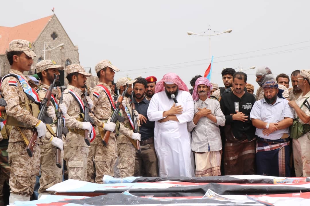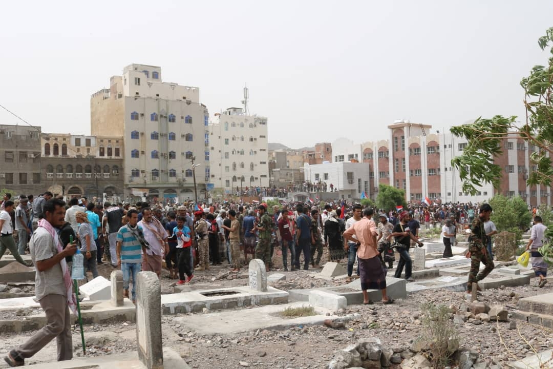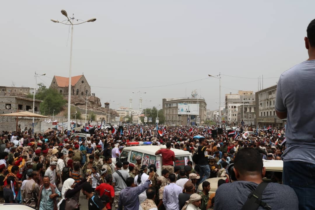 الحشود التي تجمعت منذ الصباح وحتى وصول الجثامين بعد صلاة الظهر، رفعت صورا للشهيد اليافعي، ورددت هتافات ثورية تمجد الشهداء وتعبر عن الاستمرار في النضال السلمي والتصعيد الشعبيي حتى الاستقلال التام واقامة الدولة الجنوبية.