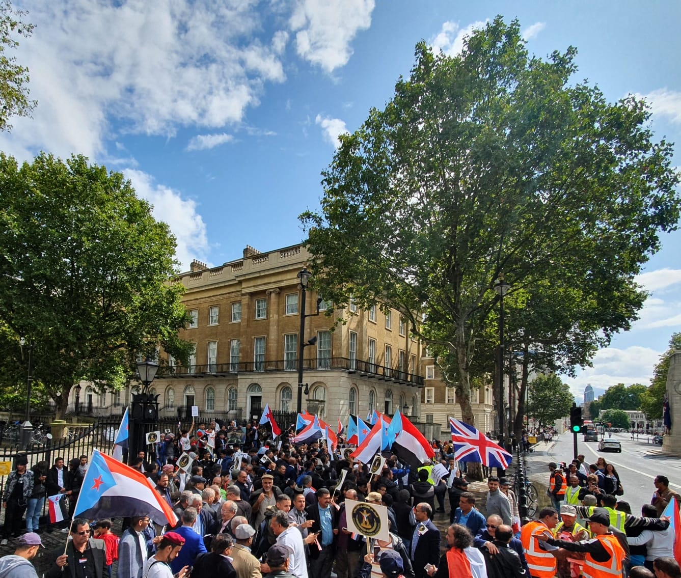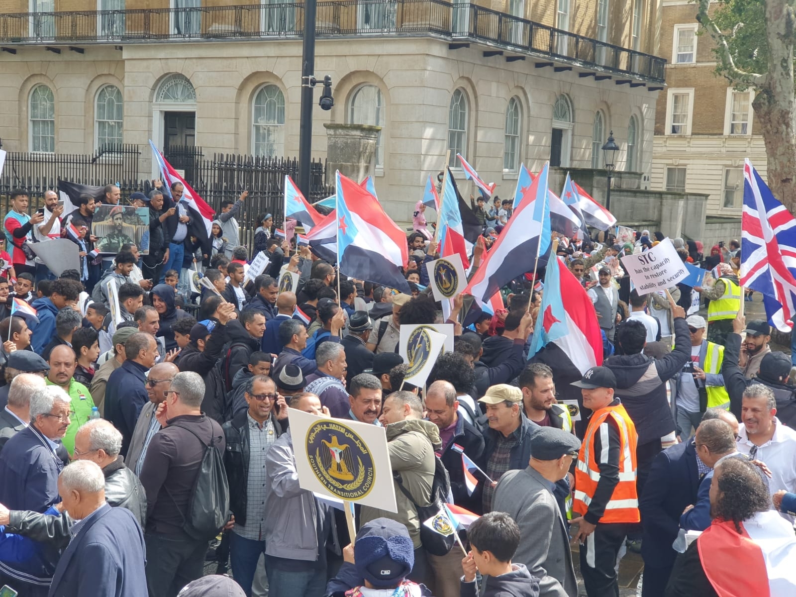 احتشد المئات من أبناء الجالية الجنوبية في المملكة المتحدة، اليوم الإثنين، ومن مختلف المدن والمقاطعات البريطانية، في تظاهرة حاشدة أمام مبنى الحكومة البريطانية في العاصمة لندن.