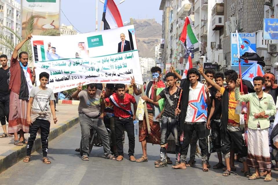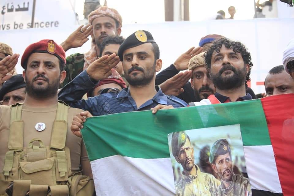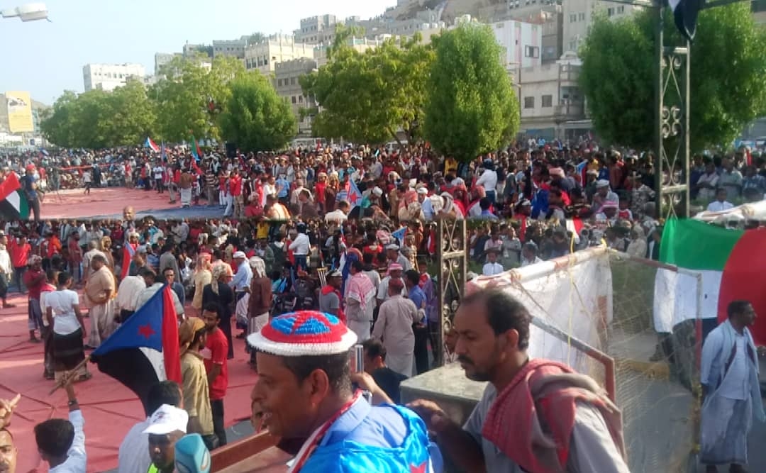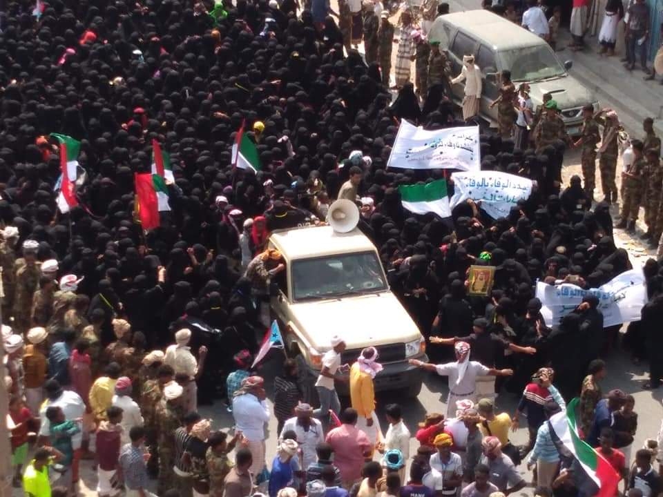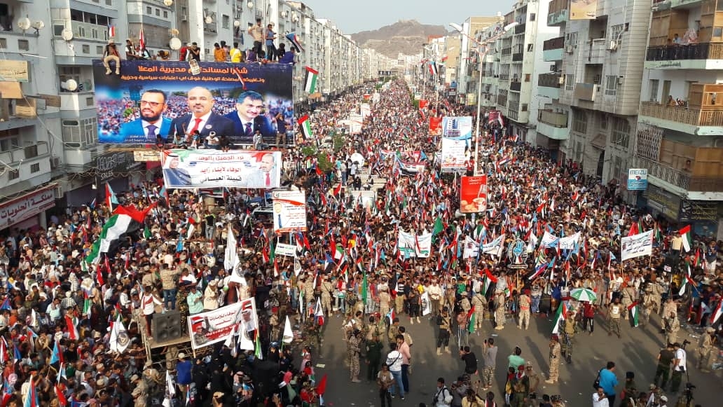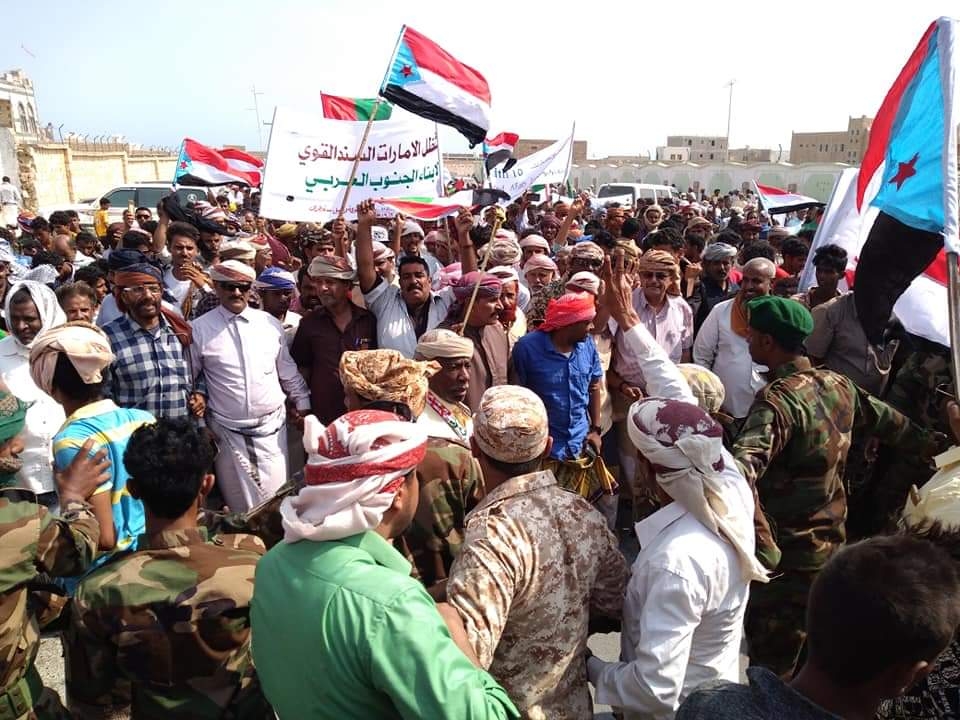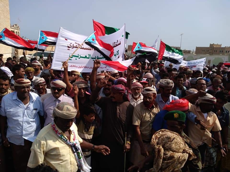 استجابة للدعوة التي وجهتها قيادة المجلس الانتقالي الجنوبي، شهد شارع الشهيد مدرم في مدينة المعلا في العاصمة عدن، وساحة القرار قرارنا في مدينة المكلا فعاليتين حاشدتين في مليونية الوفاء للأشقاء في دولة الإمارات العربية المتحدة ودول التحالف، وتأييداً للخطوات التي قام بها المجلس الانتقالي الجنوبي لمكافحة العناصر الإرهابية المتسترة تحت غطاء ما يسمى بالشرعية اليمنية.