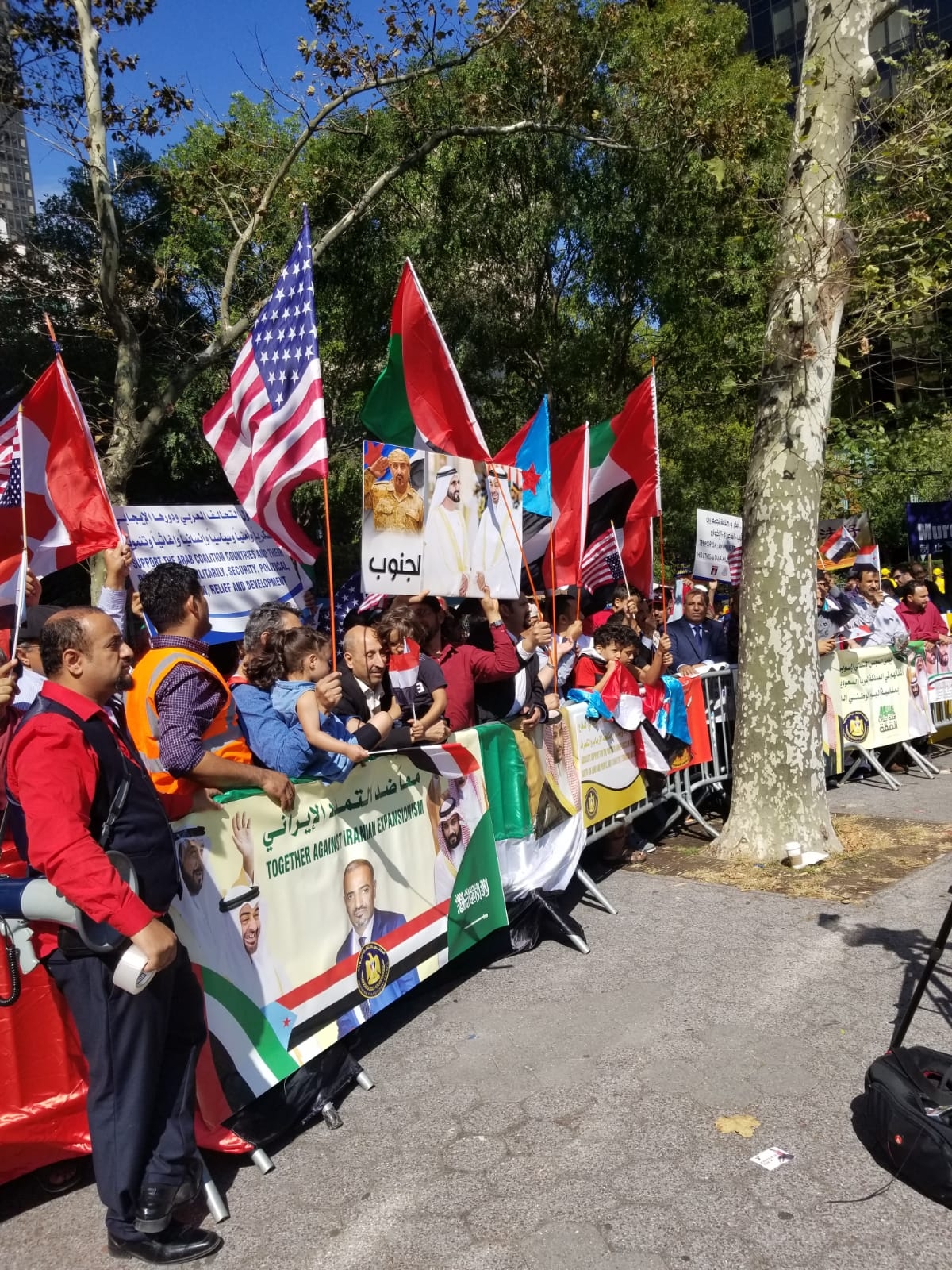 الحمد لله رب العالمين والصلاة والسلام على سيدنا محمد ، في الوقت الذي لا يزال يمر فيه وطننا الجنوبي بظروف استثنائية جراء الحروب المفروضة عليه من قِبل مليشيات الإرهاب اليمنية بشقيها الاخواني والحوثي ، خرج المئات من ابناء الجنوب اليوم ٢٨ سبتمبر ٢٠١٩م من الولايات المتحدة وكندا إلى هذا المكان امام مقر الامم المتحدة الذي يلتقي فيه رؤساء العالم لتأكيد ثبات وفائهم ومواقفهم الداعمة لشعب الجنوب ونضالاته وحرب الدفاع التي يخوضها لاجل حماية سيادته وكرامته واراضيه مضياً في إسترداد الدولة كاملة السيادة باذن الله تعالى ، وإلى كل ذلك نؤكد نحن الحاضرون على ما يلي :
