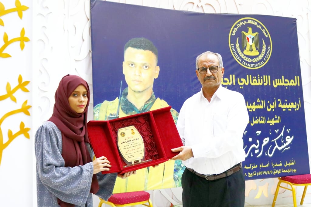 هذا وكرّم الأستاذ فضل الجعدي، أسرة الشهيد بدرع مقدم من قيادة المجلس الانتقالي على الأدوار البطولية و التضحيات التي قدمتها الأسرة .