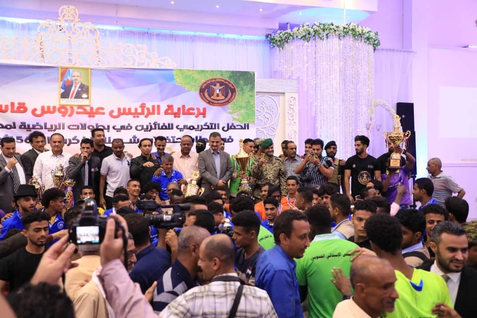 برعاية الرئيس القائد عيدروس قاسم الزُبيدي، رئيس المجلس الانتقالي الجنوبي، نظمت دائرة الشباب والطلاب في الأمانة العامة لهيئة رئاسة المجلس الانتقالي الجنوبي، اليوم الخميس، حفلاً تكريمياً للفائزين في البطولات الرياضية لمهرجان عدن الرياضي الأول، الذي نظمته الدائرة في إطار احتفالات شعبنا بالذكرى الـ56 لثورة 14 أكتوبر المجيدة، بحضور الأستاذ أحمد حامد لملس، الأمين العام لهيئة رئاسة المجلس الأنتقالي الجنوبي، والأستاذ فضل محمد الجعدي مساعد الأمين العام، والمحامية نيران سوقي والأستاذ لطفي شطارة، عضوا هيئة رئاسة المجلس، واللواء شلال علي شائع مدير أمن العاصمة عدن.