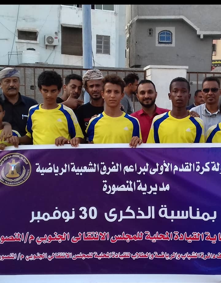 دشنت إدارة الشباب والرياضة بالقيادة المحلية للمجلس الانتقالي الجنوبي بالمنصورة بالعاصمة عدن، عصر اليوم بطولة كرة القدم للبراعم الخاصة بفرق الأحياء الشعبية بالمديرية، وذلك ضمن احتفالات شعبنا الجنوبي بالذكرى الـ 52 لعيد الـ 30 من نوفمبر يوم الاستقلال الوطني المجيد.