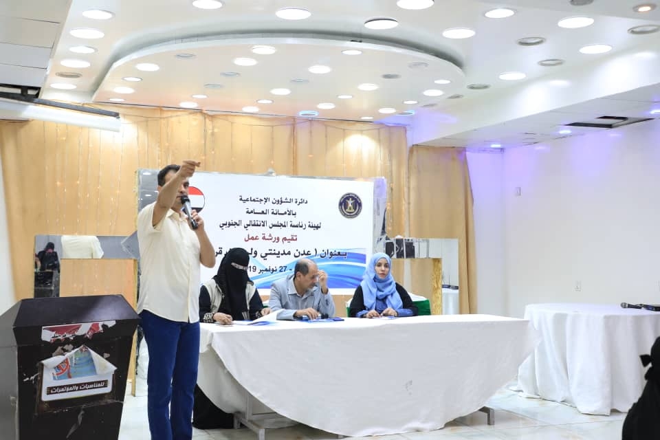 نظمت دائرة الشؤون الاجتماعية في الأمانة العامة لهيئة رئاسة المجلس الانتقالي الجنوبي، اليوم الثلاثاء في العاصمة عدن، ورشة عمل لمنظمات ومؤسسات المجتمع المدني تحت عنوان "عدن مدينتي وليست قريتي".