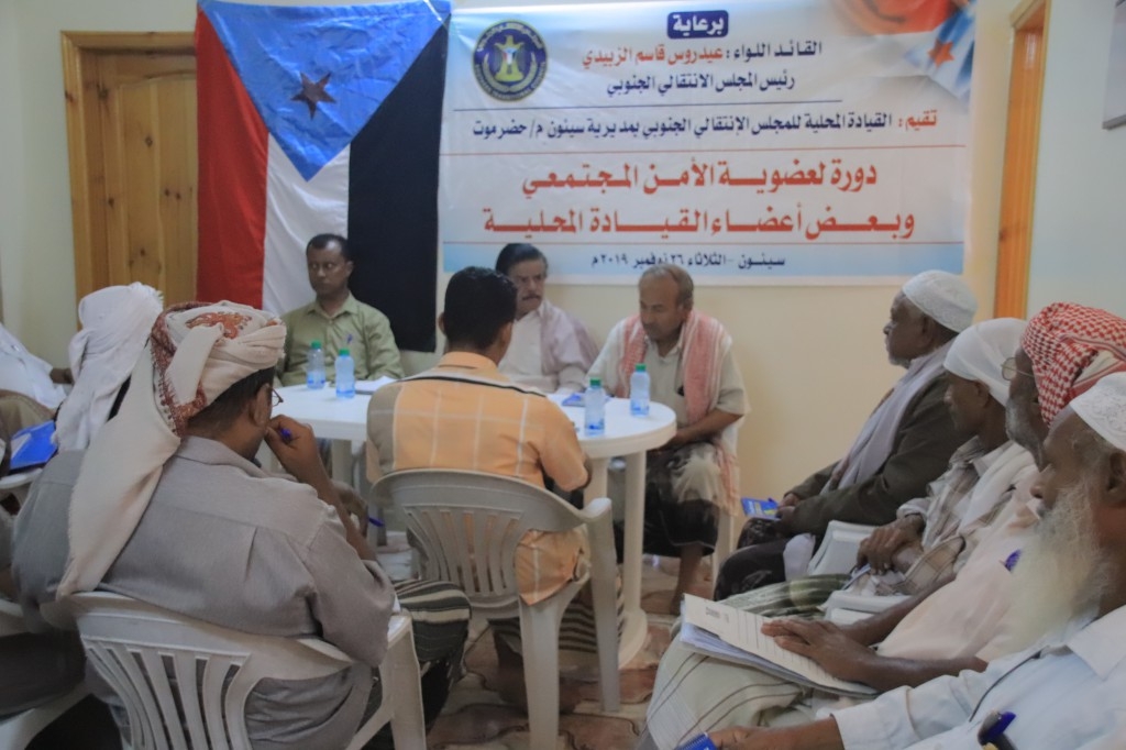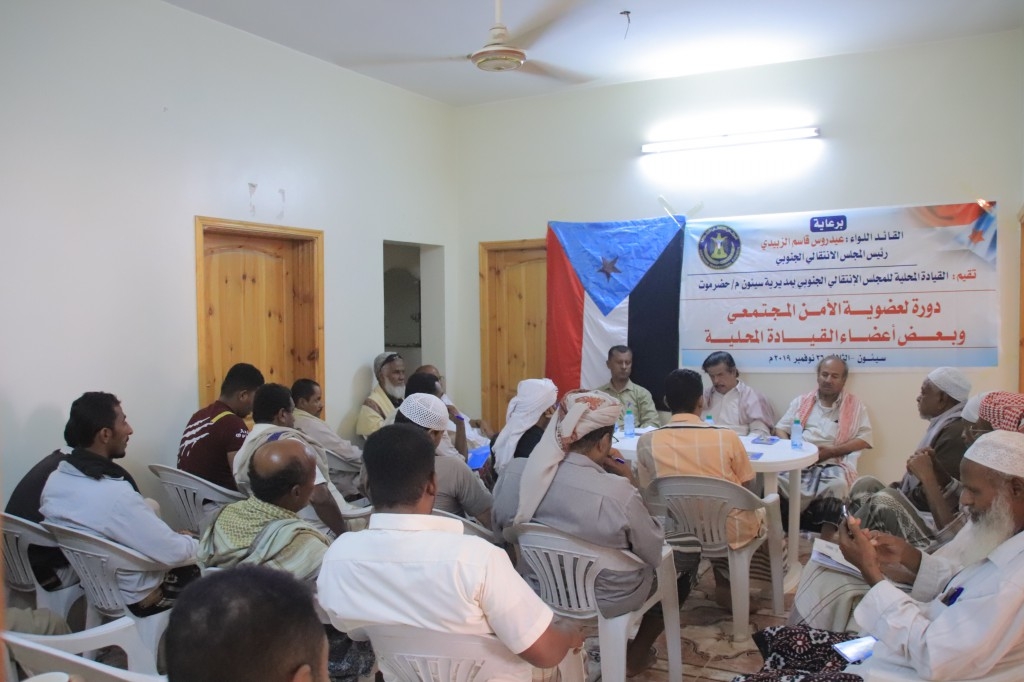 نظمت الهيئة التنفيذية للقيادة المحلية للمجلس الانتقالي الجنوبي بمديرية سيئون، دورة تدريبية لأعضاء القيادة ولجان المراكز المحلية حول أساسيات تنفيذ مهام الأمن المجتمعي في الأحياء السكنية بالمديرية.