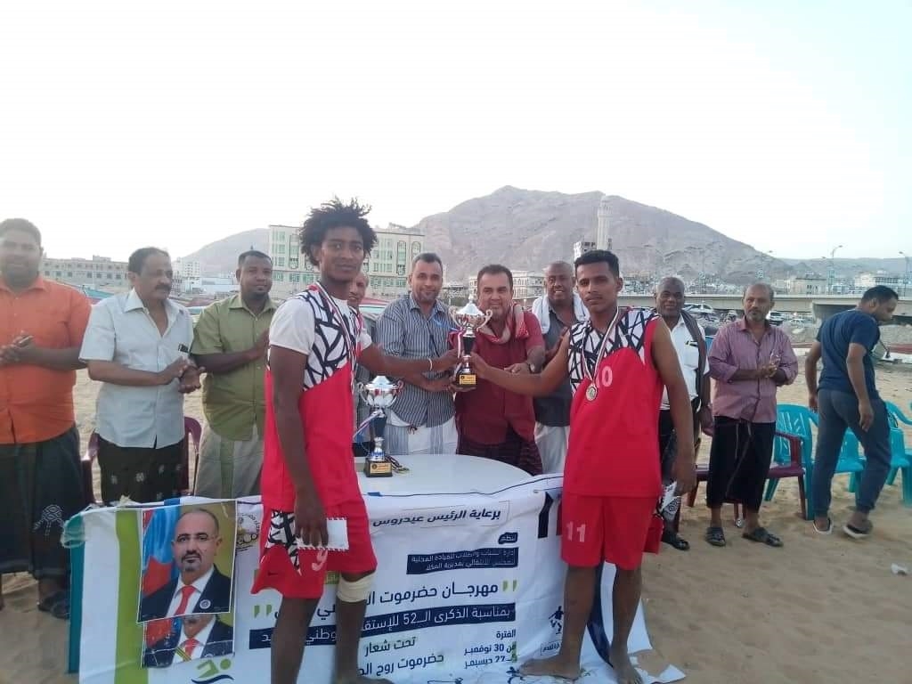 اختتمت على ملاعب الخيصة بحي السلام وسط مدينة المكلا، منافسات بطولة كرة الطائرة الشاطئية لفرق أندية مديرية المكلا والتي تأتي ضمن الفعاليات الرياضية لمهرجان حضرموت الاول تزامن مع احتفالات شعبنا بعيد الاستقلال الثلاثين من نوفمبر المجيد، بإشراف دائرة الشباب والطلاب بالأمانة العامة لهيئة رئاسة المجلس الانتقالي و تنظيم ادارة الشباب والطلاب لانتقالي المكلا و بالتنسيق مع مكتب وزارة الشباب والرياضة ساحل حضرموت و تنفيذ اتحاد كرة الطائرة الشاطئية.