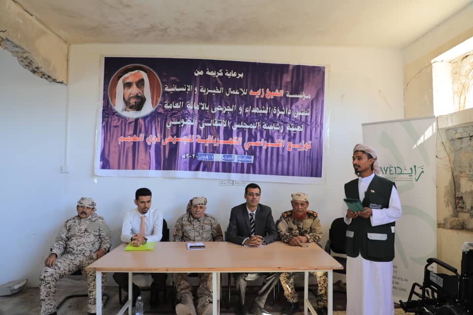 وأضاف الأستاذ أسامة محسن، أن دائرة الشهداء والجرحى وبرعاية كريمة من مؤسسة الشيخ زايد للأعمال الخيرية والإنسانية، تُهدي جرحى الضالع عدد (٢٤) كرسيا كهربائيا من إجمالي(١٠٠) كرسي قدمتهم المؤسسة على مستوى المحافظات الجنوبية، مشيرا إلى أن هذا الدعم يعد مرحلة أولى سوف تليها مراحل أخرى قادمة.