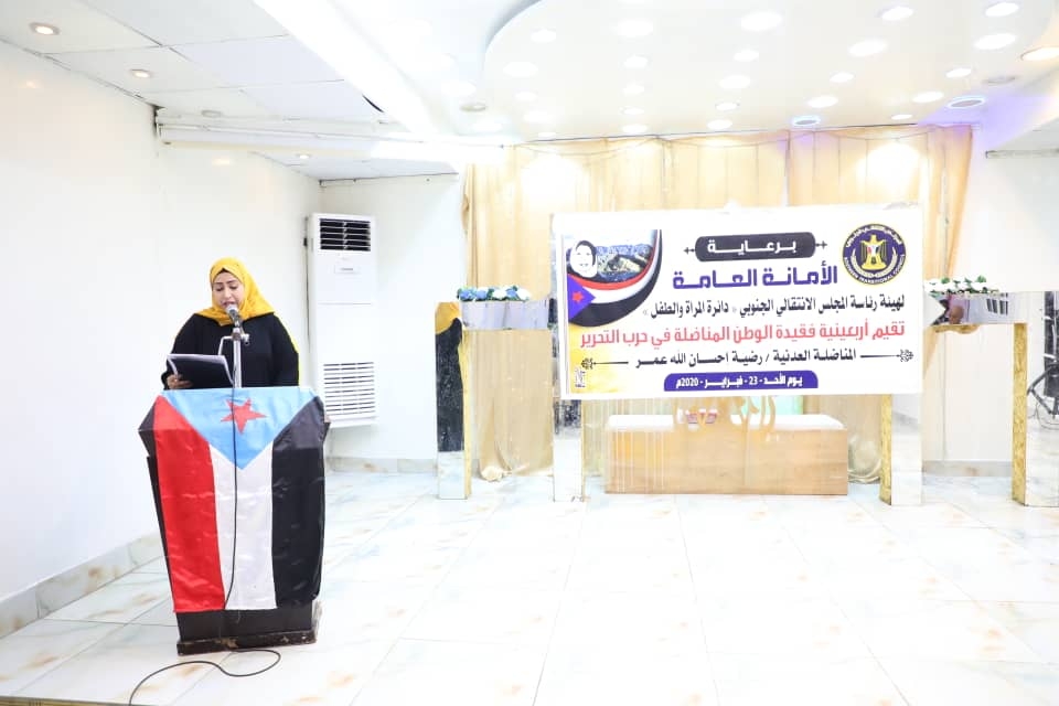 نظمت دائرة المرأة والطفل في الأمانة العامة لهيئة رئاسة المجلس الانتقالي الجنوبي اليوم الاحد في العاصمة عدن فعالية تأبين لأربعينية الفقيدة المناضلة الجنوبية رضية إحسان الله عمر، بحضور الدكتور عبدالعزيز الدالي، مستشار رئيس المجلس الانتقالي الجنوبي للشؤون الخارجية.