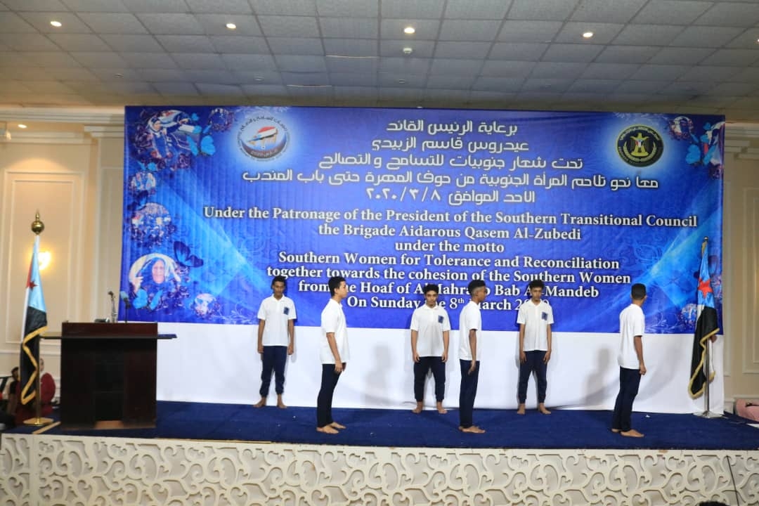 وقدمت في الحفل لوحة فنية تعبيرية عن والتصالح تضمنت تمثيلا لجميع المحافظات الجنوبية من إعداد مركز الفنون والثقافة والموروث الشعبي للمرأة الجنوبية.