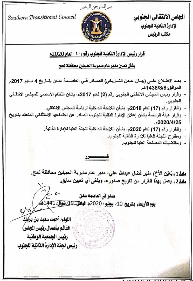 أصدر اللواء أحمد سعيد بن بريك، رئيس الجمعية الوطنية للمجلس الانتقالي، رئيس الإدارة الذاتية للجنوب، اليوم الأربعاء، القرار رقم 10 لسنة 2020، قضت مادته الأولى بتعيين الأخ منير فضل عبدالله علي مديراً عاماً لمديرية الحبيلين بمحافظة لحج.