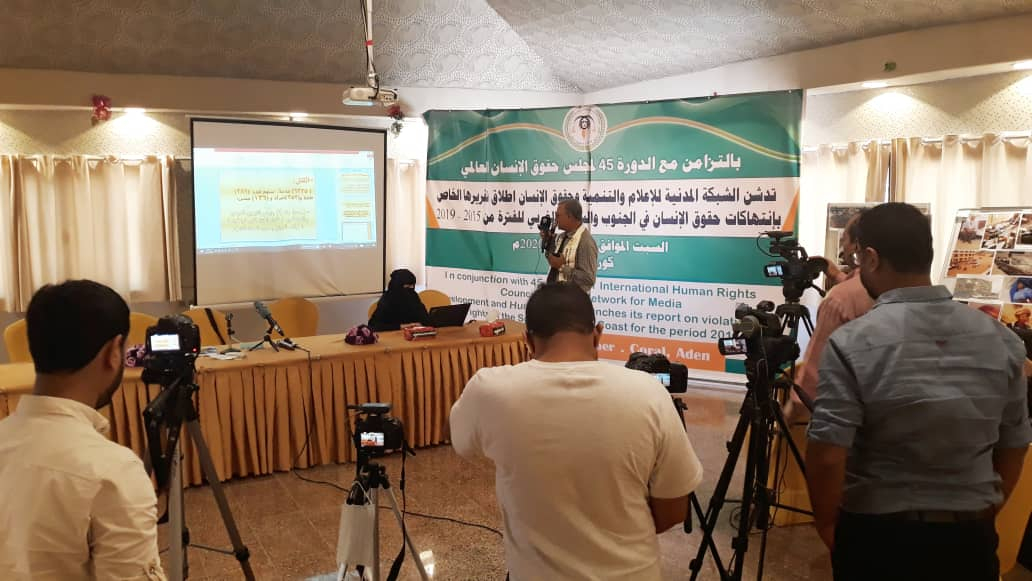 وكان الدكتور محمود شايف، رئيس الشبكة المدنية للإعلام والتنمية وحقوق الإنسان، قد افتتح المؤتمر الصحفي لتدشين التقرير الحقوقي بالترحيب بالحضور مشيرا إلى أن اطلاق هذا التقرير شهد فترة تأجيل نظرا لجائحة فيروس كورونا وهاهو يظهر اليوم بالتزامن مع الدورة الـ45 لمجلس حقوق الانسان، وأيضا بالتزامن مع هذه المرحلة الصعبة التي تعيشها الساحة الجنوبية من أزمات اقتصادية وتدهور في الخدمات وانقطاع الرواتب وانتشار الأوبئة والأمراض، ومايتم فيها من انتهاكات لحقوق الإنسان كالأعمال العدائية من قبل الحوثيين في الضالع والساحل الغربي، وخاصة ماتتعرض له الضالع من تدمير وتهجير لمنطقة تبدو وكأنها منسية من المجتمع الدولي وسط عدم اهتمام من المنظمات الدولية، وكذلك مايعانيه المواطنون في شبوة من انتهاكات تقوم بها الميليشيات الإخوانية والقوات الخاصة المحسوبة على الشرعية.