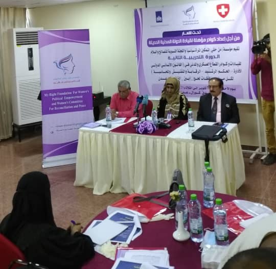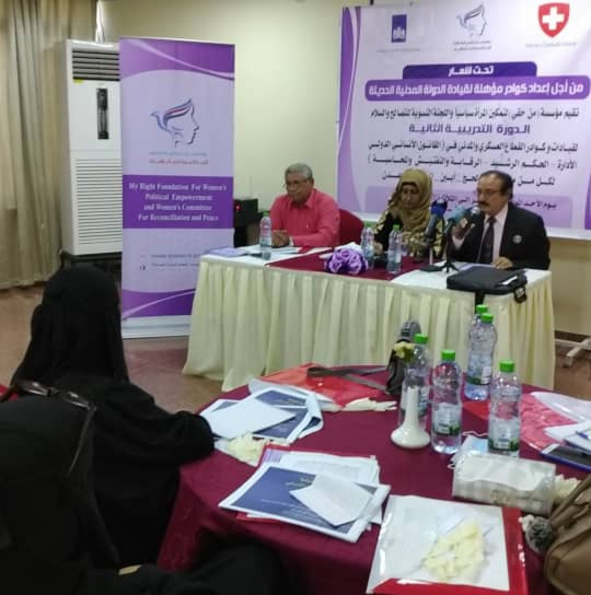دشنت مؤسسة من حقي لتمكين المرأة سياسيا، واللجنة النسوية للتصالح والسلام اليوم الأحد في العاصمة عدن، الدورة التدريبية الثانية في "القانون الدولي الانساني - الادارة - الحكم الرشيد - الرقابة والتفتيش والمحاسبة"، لقيادات وكوادر القطاع العسكري والمدني في محافظات أبين، الضالع، لحج، والعاصمة عدن، وبمشاركة كوادر من الأمانة العامة لهيئة رئاسة المجلس والجمعية الوطنية.