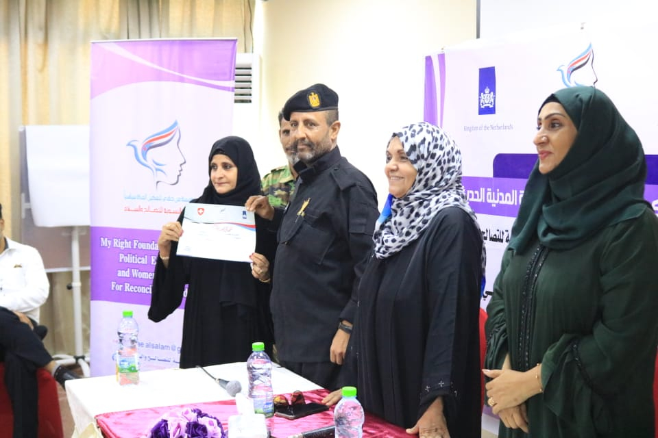 وكانت فاطمة العاقل، نائبة رئيس مؤسسة من حقي قد ألقت كلمة في ختام الدورة بالنيابة عن انتصار الهدالي رئيسة المؤسسة، قدمت فيها الشكر للواء أحمد سعيد بن بريك القائم بأعمال رئيس المجلس الانتقالي، رئيس الجمعية الوطنية، لماقدمه من تسهيلات فيما يخص هذه الدورة، كما قدمت شكرها للحكومتين الهولندية والسويسرية على دعمها ورعايتها، وللمدربين والمشاركين على الالتزام.
