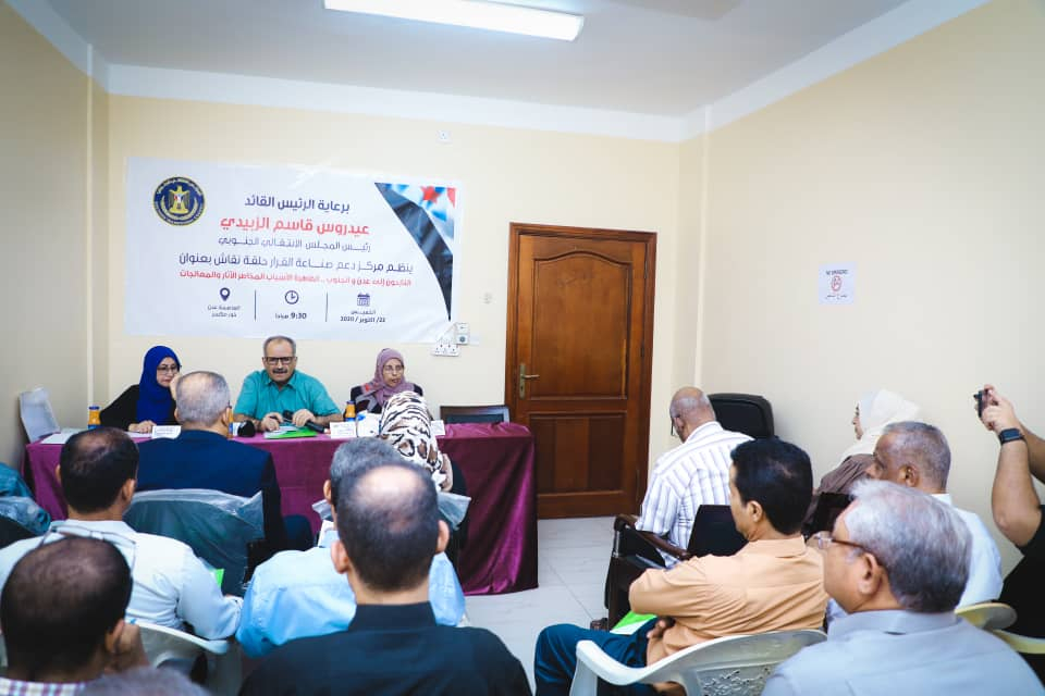 نظم مركز دعم صناعة القرار بالمجلس الانتقالي الجنوبي، اليوم الخميس، حلقة نقاشية بعنوان " النازحون إلى عدن والجنوب.. الظاهرة، الأسباب والمخاطر، الآثار، والمعالجات"، برعاية الرئيس القائد عيدروس الزُبيدي رئيس المجلس الانتقالي.