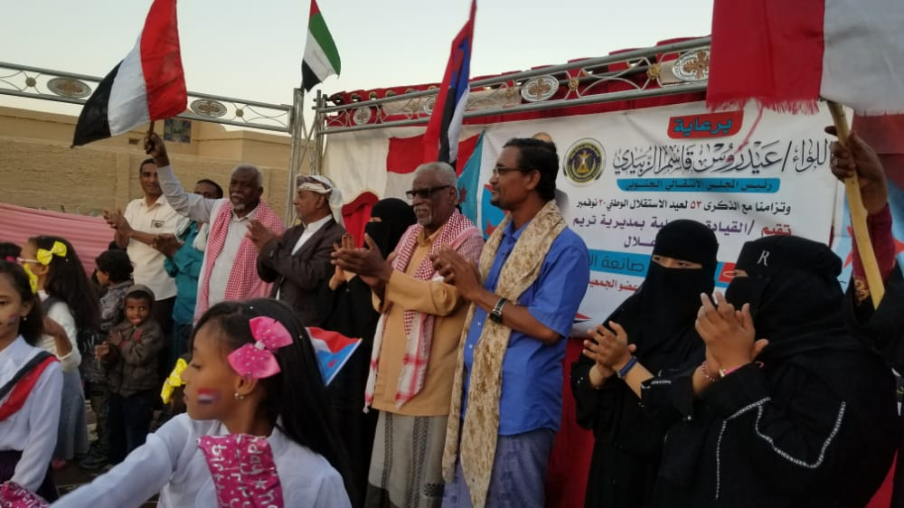 نظمت لجنة المرأة والطفل الجنوبي بمركز باعلال التابع للقيادة المحلية للمجلس الانتقالي الجنوبي في مديرية تريم، عصر اليوم الجمعة، حفلا خطابيا وفنيا بمناسبة عيد الاستقلال 30 نوفمبر الذكرى الـ53 للاستقلال الوطني.