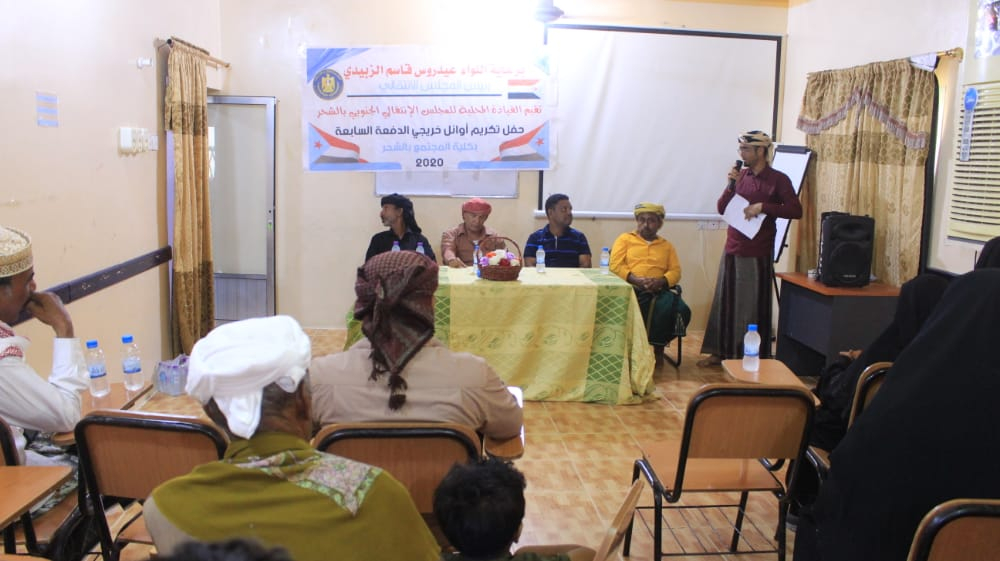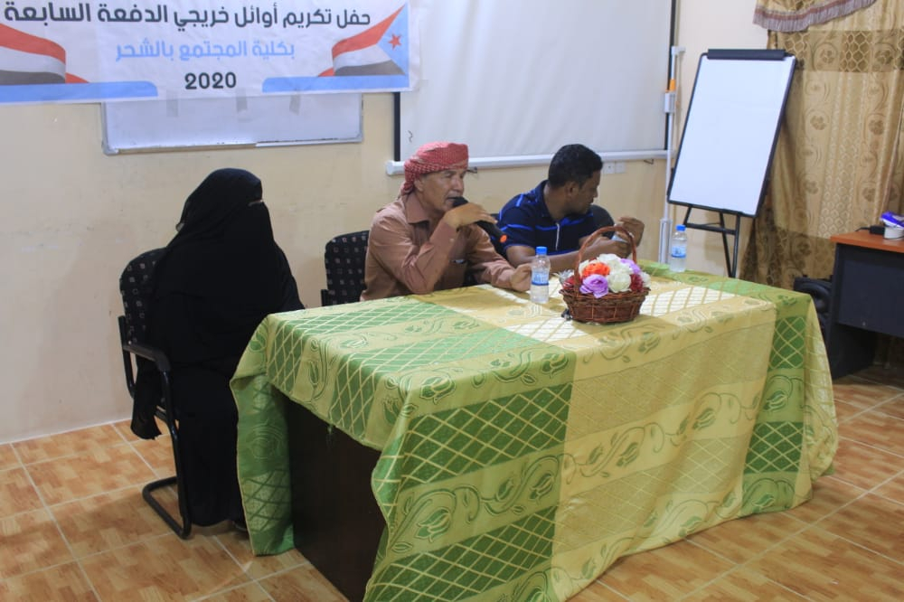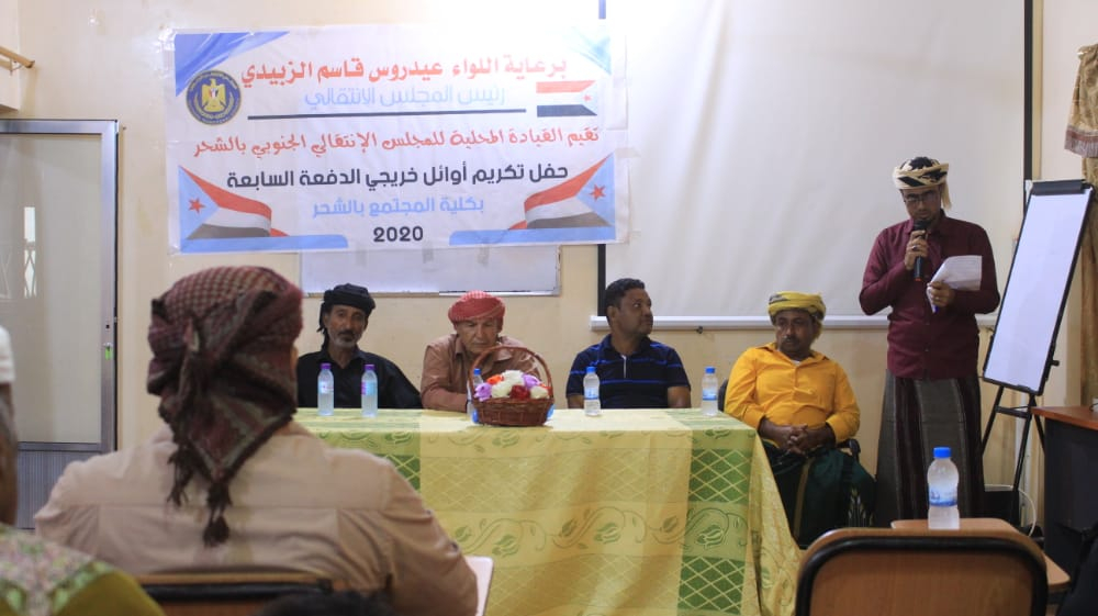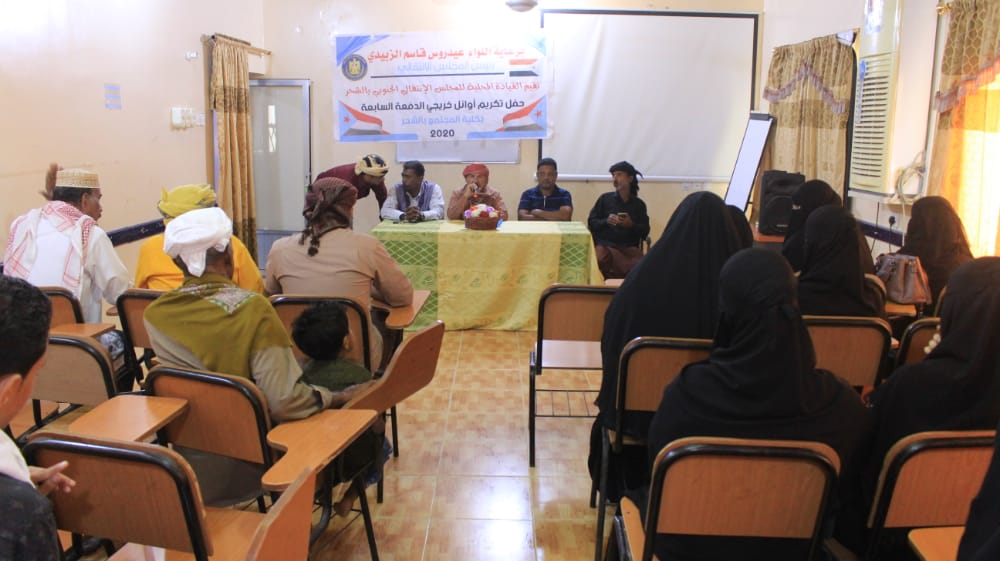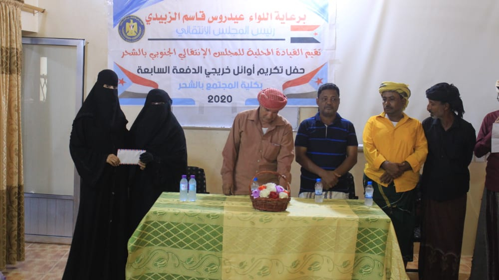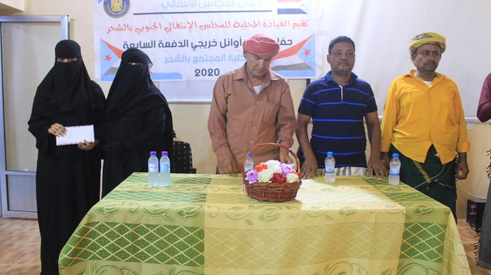 أقامت القيادة المحلية بالمجلس الانتقالي بمديرية الشحر وإدارة الشباب والطلاب، مساء الخميس، حفلاً تكريماً لأوائل خريجات الدفعة السابعة بكلية المجتمع، برعاية كريمة من الرئيس القائد عيدروس قاسم الزُبيدي رئيس المجلس الانتقالي، وتزامنا مع ذكرى عيد الاستقلال المجيد.