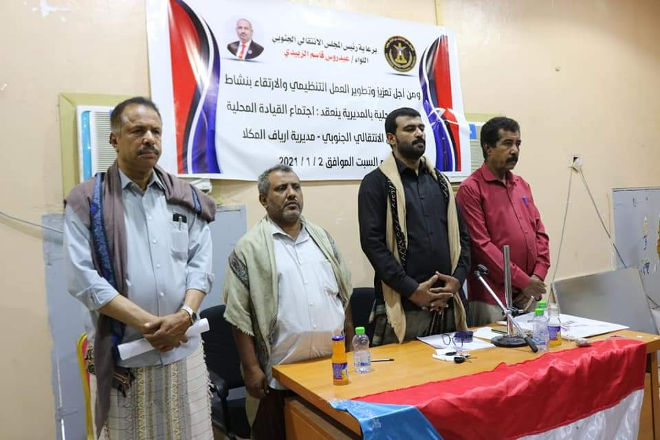 عقدت القيادة المحلية للمجلس الانتقالي الجنوبي بمديرية أرياف المكلا، اليوم السبت، اجتماعها الموسع للعام 2021م، برئاسة فاروق أحمد العكبري، رئيس الهيئة التنفيذية للقيادة المحلية للمجلس الانتقالي الجنوبي بمديرية أرياف المكلا.