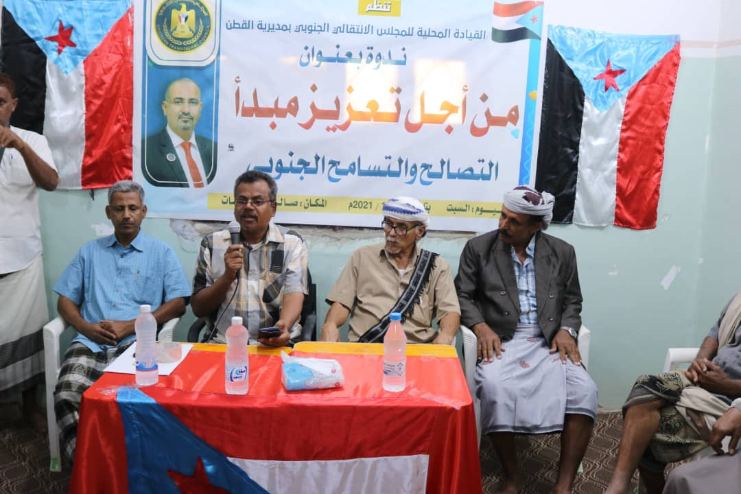 نظمت الهيئة التنفيذية للقيادة المحلية للمجلس الانتقالي الجنوبي بمديرية القطن اليوم السبت، ندوة سياسية بعنوان " من أجل تعزيز مبدأ التصالح والتسامح الجنوبي " لأعضاء الهيئة التنفيذية ورؤساء ونواب اللجان المحلية بالمراكز، بحضور محمد حسين الحداد رئيس الهيئة، ونائبه عبدالعزيز احمد البكري .