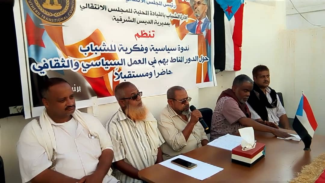 نظمت إدارة الشباب والطلاب بالهيئة التنفيذية للقيادة المحليه للمجلس الانتقالي الجنوبي بمديرية الديس الشرقية بمحافظة حضرموت اليوم الثلاثاء، ندوة سياسية وفكرية لشباب المديرية حول "الدور المناط بالشباب في العمل السياسي والثقافي حاضرا ومستقبلا" بحضور صلاح أحمد الكسادي رئيس تنفيذية انتقالي المديرية.