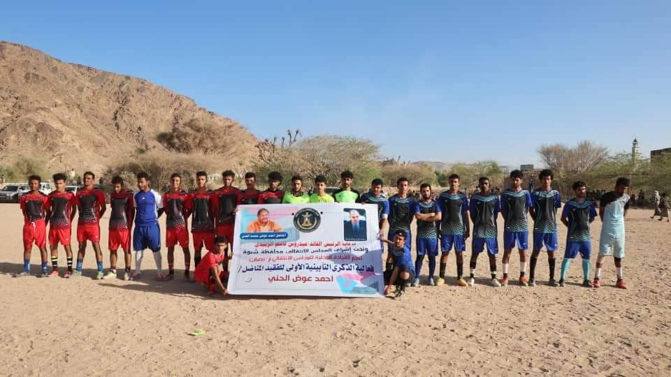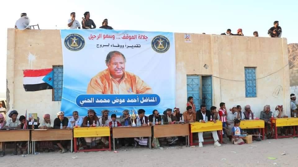 أقامت القيادة المحلية بالمجلس الانتقالي الجنوبي بمديرية نصاب بمحافظة شبوة، فعالية جماهيرية رياضية كبرى عصر اليوم الأحد بمنطقة وادي عبدان بمناسبة الذكرى الأولى لرحيل عضو الجمعية الوطنية للمجلس الانتقالي المناضل الجسور احمد عوض الحني، برعاية كريمة من الرئيس القائد عيدروس قاسم الزُبيدي، وبإشراف من قيادة المجلس الانتقالي بمحافظة شبوة.
