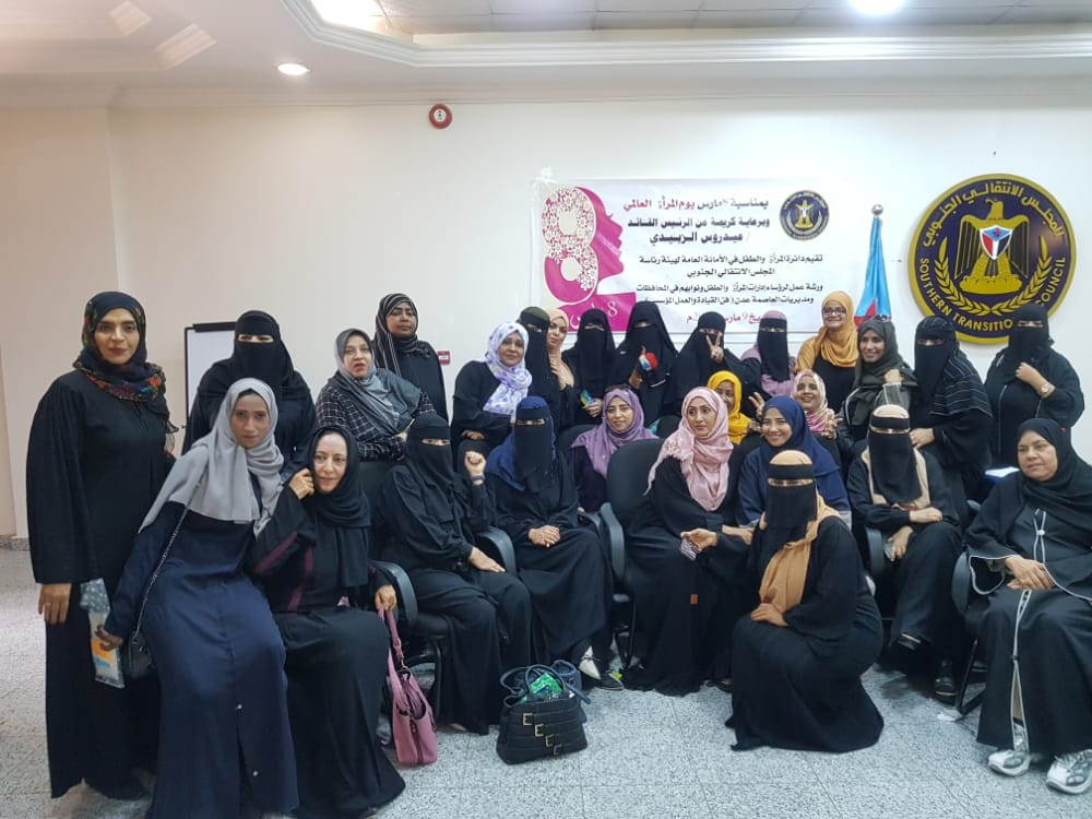 نظمت دائرة المرأة والطفل في الأمانة العامة لهيئة رئاسة المجلس الانتقالي، اليوم الثلاثاء، برعاية كريمة من الرئيس القائد عيدروس قاسم الزُبيدي رئيس المجلس الانتقالي الجنوبي، ورشة عمل لمديري إدارات المرأة والطفل ونوابهم في المحافظات، ومديريات العاصمة عدن بمناسبة اليوم العالمي للمرأة، وذلك في "فن القيادة والعمل المؤسسي".