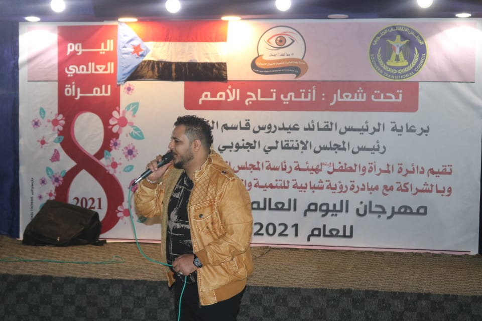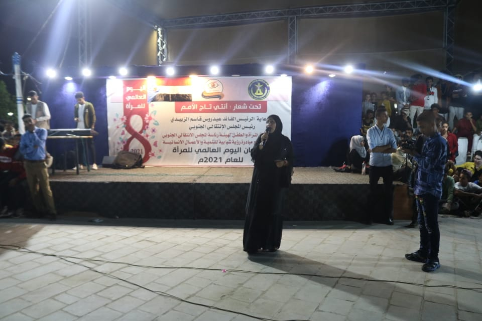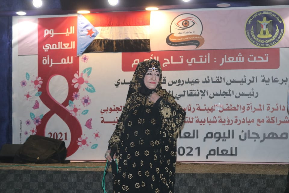 نظمت دائرة المرأة والطفل في الأمانة العامة لهيئة رئاسة المجلس الانتقالي الجنوبي، اليوم الجمعة، في حديقة منتزه المول في العاصمة عدن برعاية كريمة من الرئيس القائد عيدروس قاسم الزبيدي رئيس المجلس الانتقالي الجنوبي وبالشراكة مع مبادرة رؤية شبابية للتنمية والأعمال الإنسانية، مهرجان اليوم العالمي للمرأة 2021م تحت شعار :"أنتي تاج الأمم".