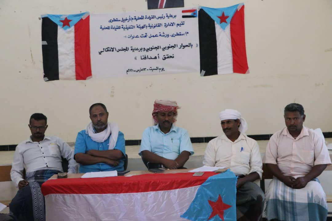 نظمت الإدارة القانونية بالهيئة التنفيذية للقيادة المحلية للمجلس الانتقالي الجنوبي بمحافظة أرخبيل سقطرى، اليوم السبت، ورشة عمل بعنوان "بالحوار الجنوبي - الجنوبي وبرعاية المجلس الانتقالي الجنوبي نحقق أهدافنا".