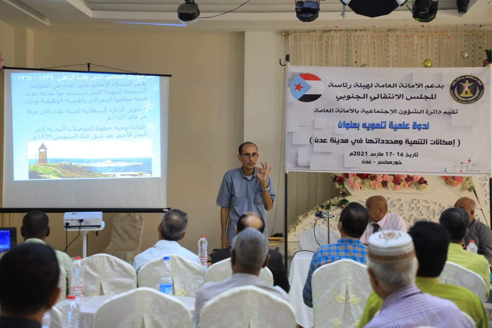 دشنت دائرة الشؤون الاجتماعية في الأمانة العامة لهيئة رئاسة المجلس الانتقالي الجنوبي، اليوم الثلاثاء، ندوة علمية حول "إمكانية التنمية و محدداتها في مدينة عدن " بقاعة سنيوريتا في العاصمة عدن .